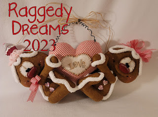 These cute Gingerbread Boy and Girl with Heart hanger measure just under 17 x 10, the Gingers are made from cinnamon felt they have black beady eyes, a red wool felt nose, blushed rosy cheeks, chenille icing. They're holding a stuffed red heart, with "Love" prim stitched in the center. They will come with a wire hanger accented with a raffia bow and a skeleton key.